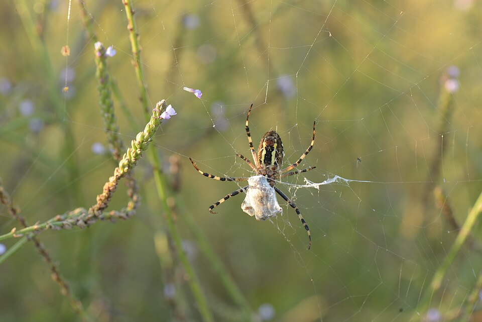 Die Wespenspinne heißt auf Latein Argiope bruennichi und gehört zur Ordnung der Webspinnen, Familie der Echten Radnetzspinnen.