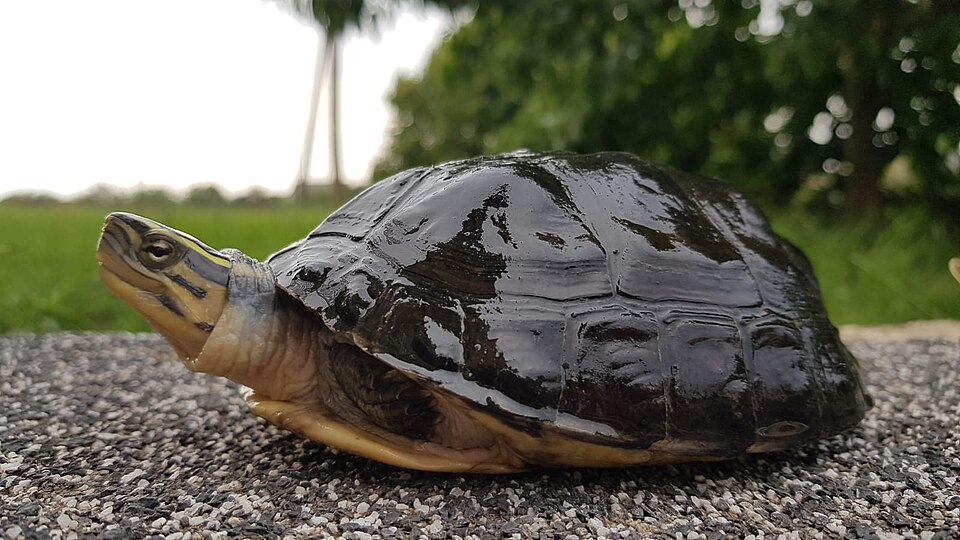 Sie heißt Amboina-Scharnierschildkröte. Ihr lateinischer Name ist Cuora amboinensis.
