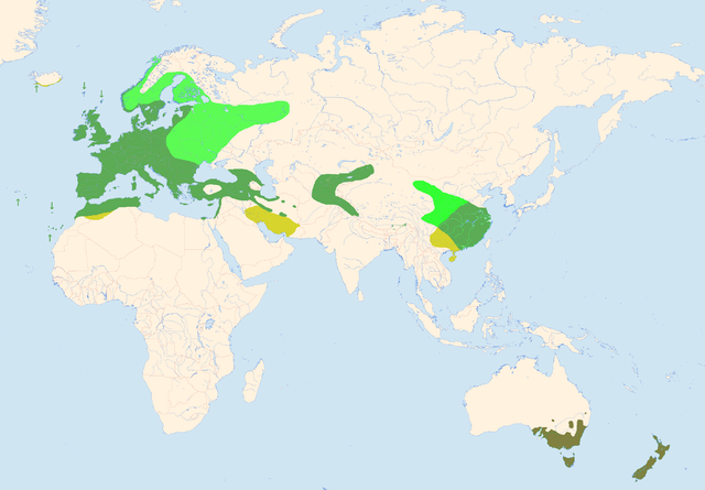 - dunkelgrün=Jahresvogel, hellgrün=Brutvogel, gelb=Winterquartier, braun=eingeführt
