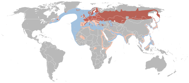dunkelrot: Brutgebiet - orange und blau: Vorkommen nur im Winter