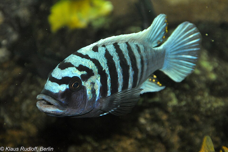 Der Masken-Tigerbarsch ist ein bunter Fisch aus Afrika. Man nennt ihn auch Blauer Malawibuntbarsch oder Zebrabuntbarsch, weil er Streifen wie ein Zebra hat.