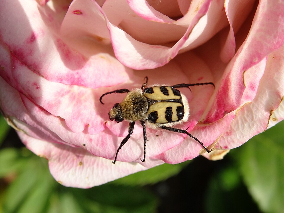 Der Käfer heißt Gebänderter Pinselkäfer. Sein wissenschaftlicher Name ist Trichius fasciatus.