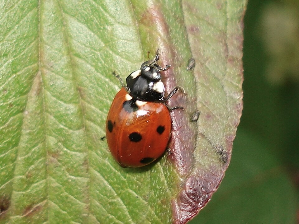Der Siebenpunkt-Marienkäfer und seine Larven fressen Blattläuse.
