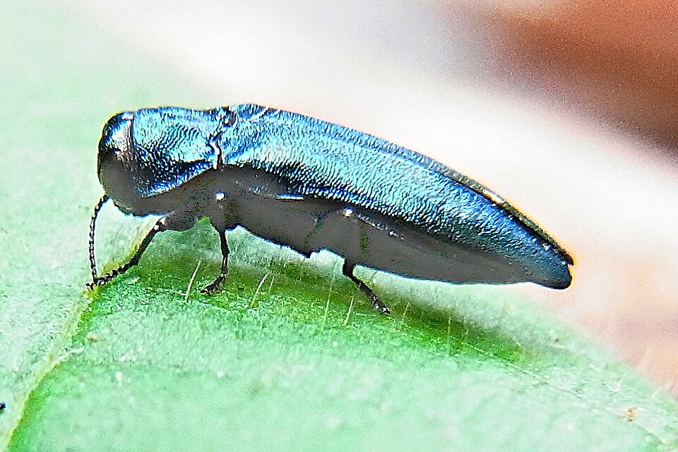 Der Käfer heißt Heckenkirschenprachtkäfer. Sein wissenschaftlicher Name ist Agrilus cyanescens.