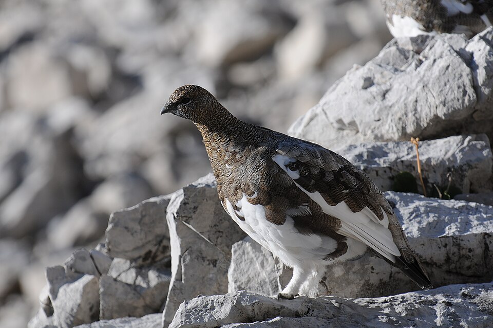 Im Winter hat es weiße Federn und ist im Schnee gut versteckt. Im Sommer sind die Federn braun und grau wie die Felsen.