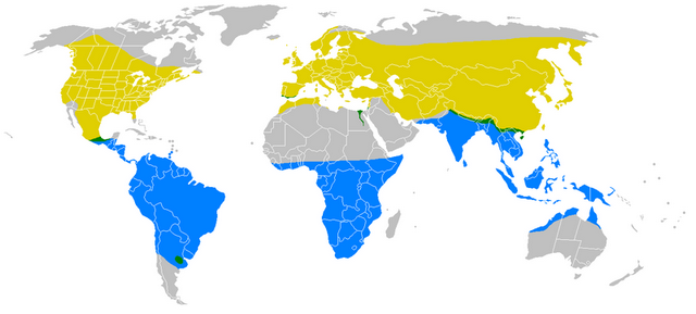 • Brutgebiete=gelb, Überwinterungsgebiete=blau, Ganzjähriges Vorkommen=grün