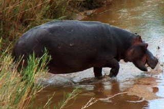 Typisch für Flusspferde ist ihr großes Maul mit großen Schneide- und Eckzähnen. Obwohl sie gefährlich aussehen, sind sie Pflanzenfresser.